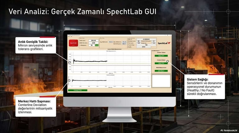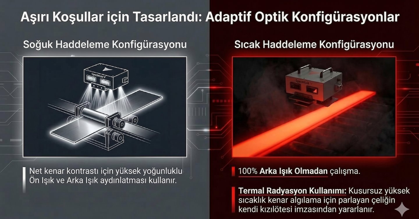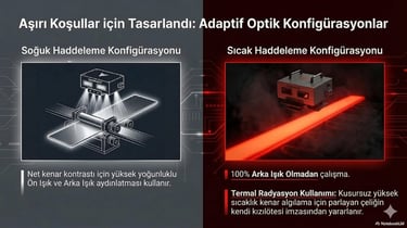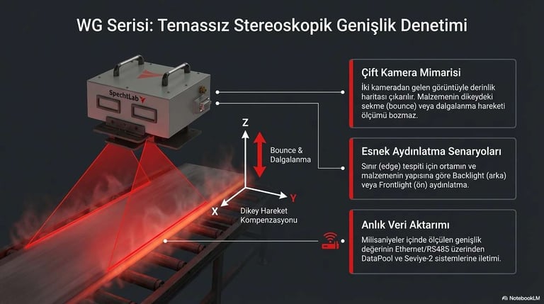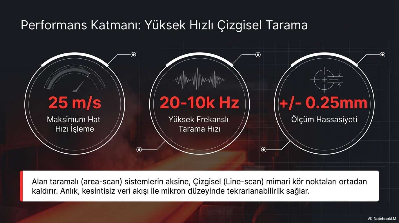 1000°C sıcaklıkta ve 25 m/s hat hızında bile %100 temassız, mikron hassasiyetinde (+/- 0.25mm) boyutsal kontrol ve kenar takibi.